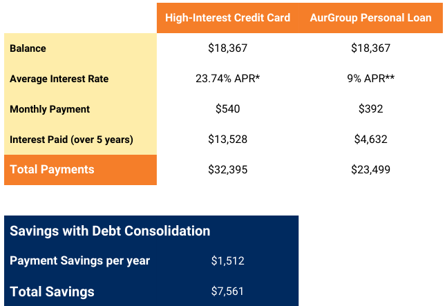 *Statistics of average credit card rate as of June 2, 2024. APR=Annual Percentage Rate. **This example assumes a fixed rate of 9% (with autopay or payroll deduction payments with Direct Deposit and an AurGroup checking account), and is based on prime credit and a 60-month term. Our rates may be higher or lower based on credit score and term. The credit card rate is based on an average of various sources and assumes that the borrower doesn’t take on any more credit card debt during the same period used in the example. Both calculations assume 60 total monthly payments and no pre-payment amounts, late payment fees, or penalties.